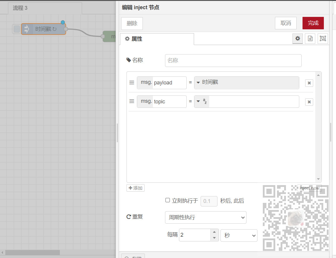[{"id":"71107f63.c2686","type":"inject","z":"f8f370d9.7ccc3","name":"","props":[{"p":"payload"},{"p":"topic","vt":"str"}],"repeat":"2","crontab":"","once":false,"onceDelay":0.1,"topic":"","payload":"","payloadType":"date","x":190,"y":280,"wires":[["6866ece6.3b1964"]]},{"id":"6866ece6.3b1964","type":"debug","z":"f8f370d9.7ccc3","name":"","active":true,"tosidebar":true,"console":false,"tostatus":false,"complete":"false","statusVal":"","statusType":"auto","x":420,"y":300,"wires":[]}] 2、指定时间阶段周期性执行