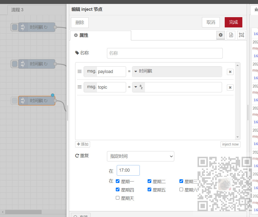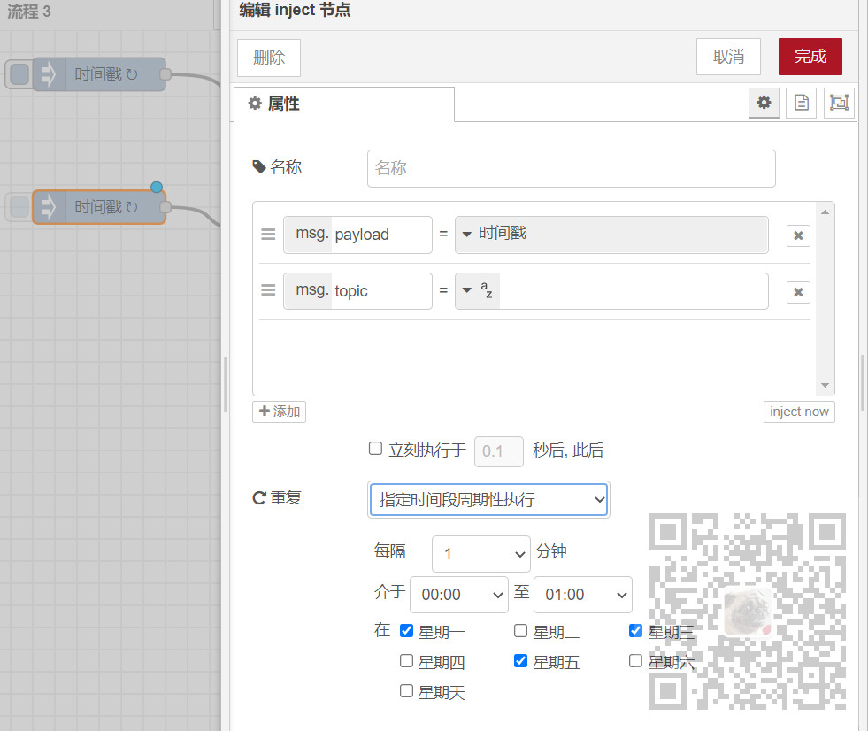[{"id":"2ee46c27fe222be5","type":"inject","z":"4bc32962b964d23d","name":"","props":[{"p":"payload"},{"p":"topic","vt":"str"}],"repeat":"","crontab":"*/1 0 * * 1,3,5","once":false,"onceDelay":0.1,"topic":"","payloadType":"date","x":190,"y":360,"wires":[["26092280afbca76a"]]},{"id":"26092280afbca76a","type":"debug","z":"4bc32962b964d23d","name":"","active":true,"tosidebar":true,"console":false,"tostatus":false,"complete":"false","statusVal":"","statusType":"auto","x":400,"y":380,"wires":[]}] 3、指定时间执行